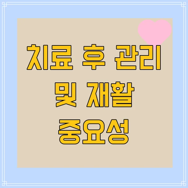 게다가, 치료가 끝난 이후에도 지속적인 관리가 필요합니다. 의사의 정기적인 검진이나 약물 관리가 필수적이죠. 이렇게 환자의 건강 상태를 모니터링함으로써, 조기 발견된 합병증이나 재발을 예방할 수 있게 됩니다. 📅 매월 또는 분기마다 정기 검진을 통해 건강상태를 체크하는 습관을 들여야 하는 이유이기도 합니다.